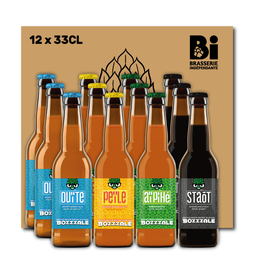 Box de 12 x 33CL composée de 3 bouteilles de 4 bières au pain Bozzzale: Wheat Ale, American Pale Ale, American IPA, American Stout…. Il y en a pour tous les (bons) goûts !